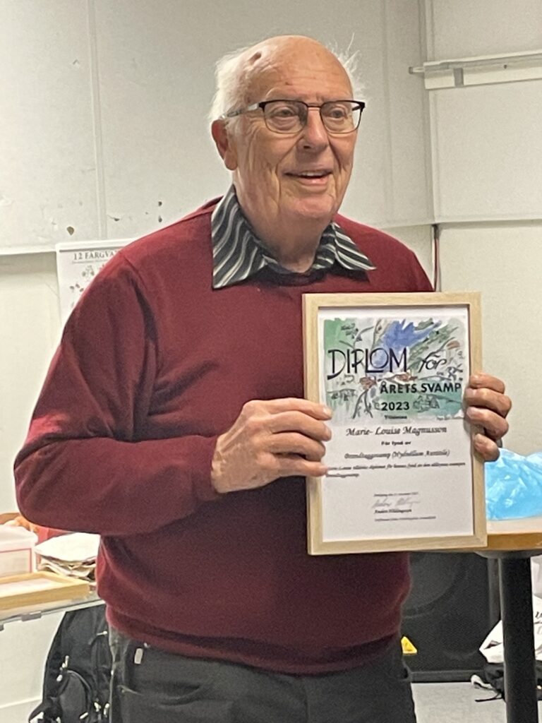 Efter att vi lyssnat på Anna åt vi oss mätta på smörgårdstårta och kakor. Tack Marcel, Anna och Maj-Britt för allt gott ni fixat! Under kvällen hann vi också med att dela ut diplom till årets svampfynd. I år gick priset till vår förnämliga kassör Marie-Louise Magnusson (som tyvärr dock inte var på plats) för rariteten brandtaggsvamp!