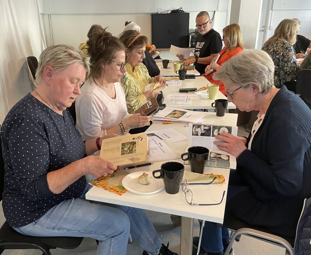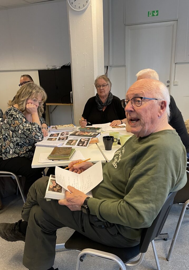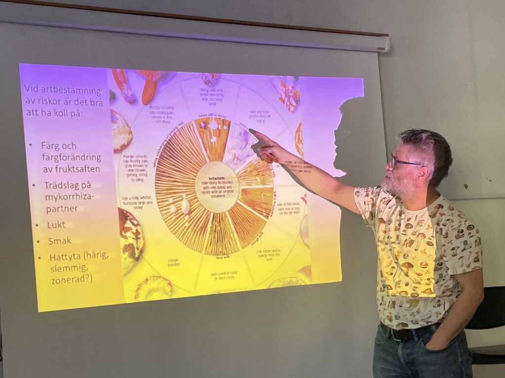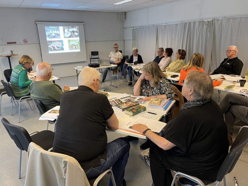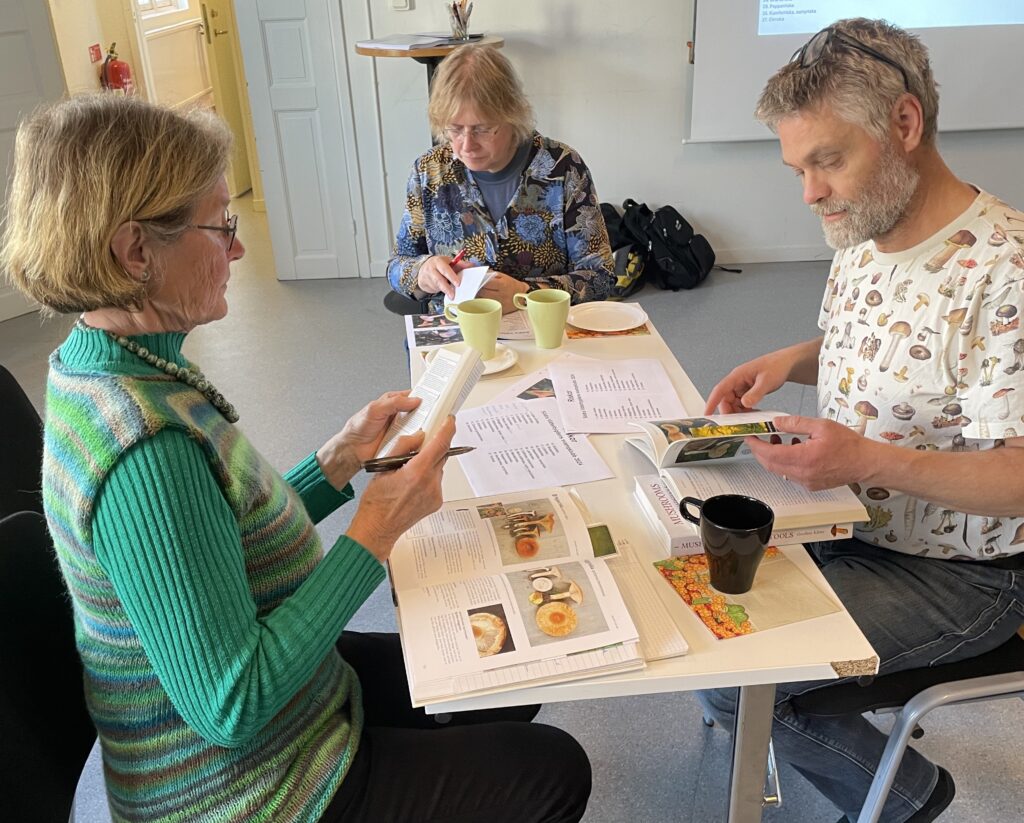 Denna kväll ägnade vi oss åt att förkovra oss i riskor. Anders och Hans föredrog kort om vad som är viktigt att tänka på vid artbestämning av riskor och därefter delade vi in oss i smågrupper som fördjupade sig i ett antal arter som sedan presenterades för alla. Till hösten ska vi leta efter alla arter vi lärt oss!