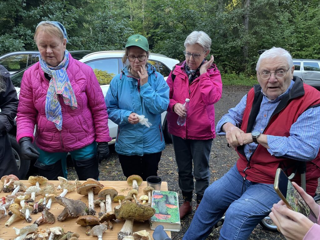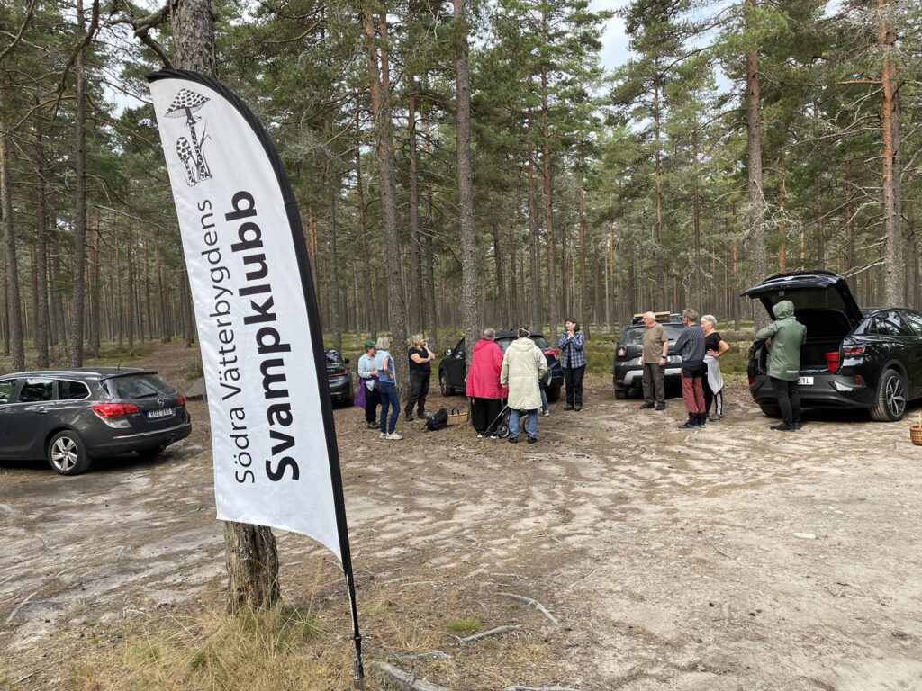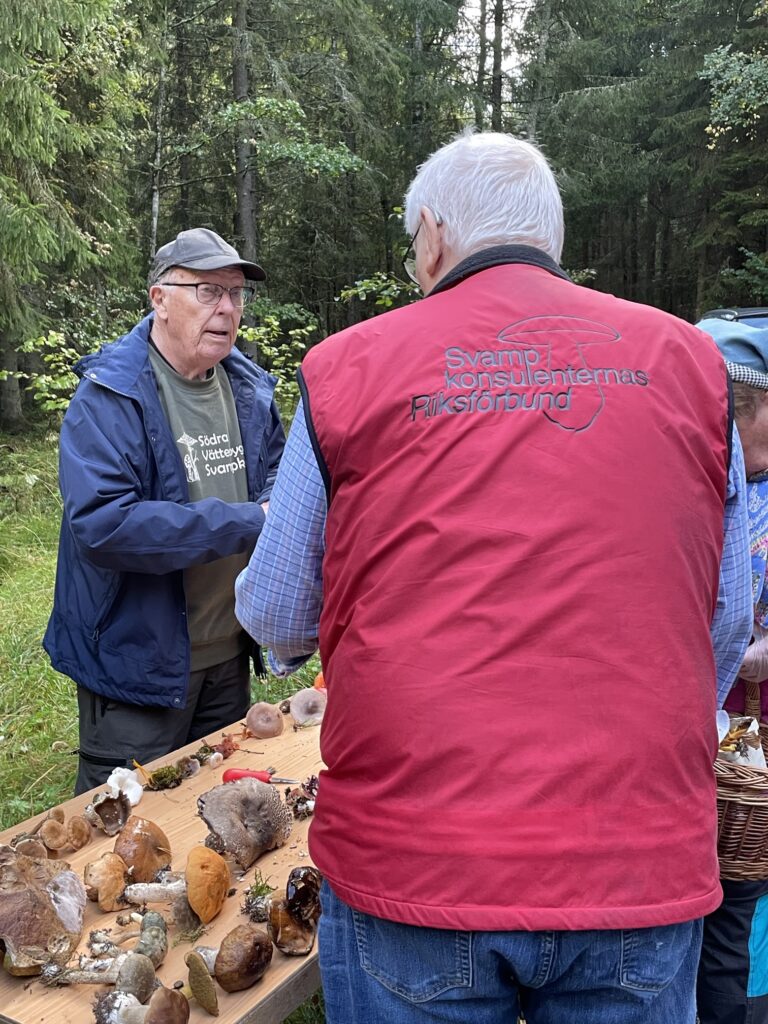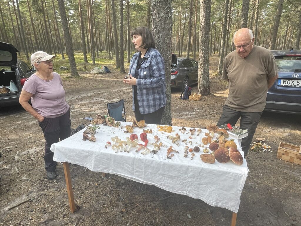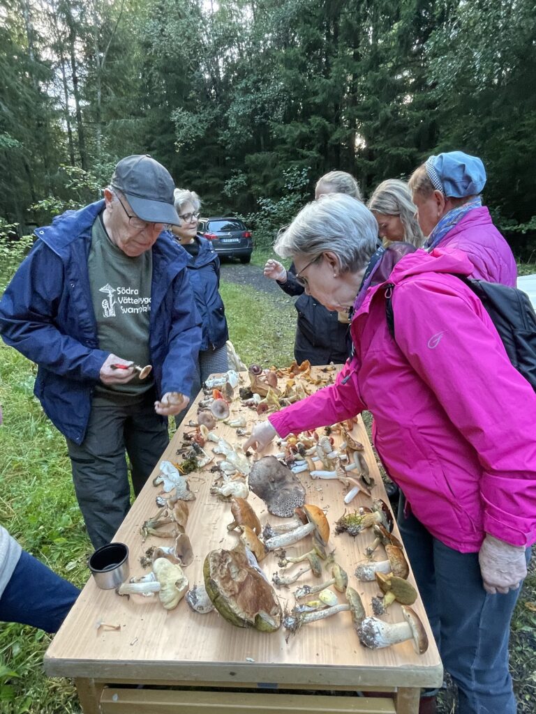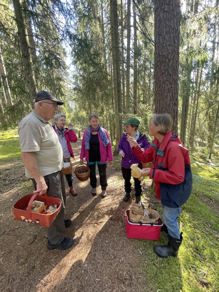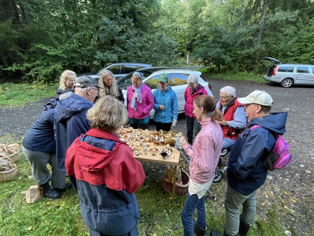 En fin dag i sandtallskogen där Anna Kjellander guidade både bland färgsvampar som dropptaggsvamp och sammetsfotad pluggskivling samt matsvampar som sandsopp och rimskivling. Ungefär 25 personer deltog i träffen som ägde rum vid Falkens grav.